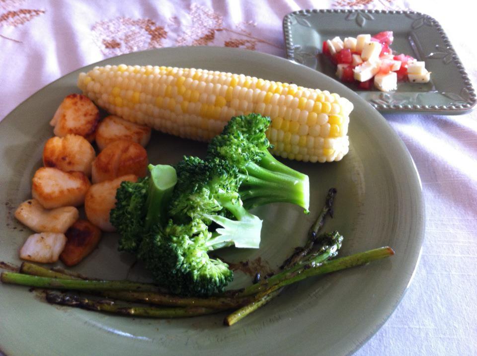 Fresh local corn, steamed broccoli, balsamic marinated asparagus and sautéed scallops with a side of tomato/mozzarella salad.