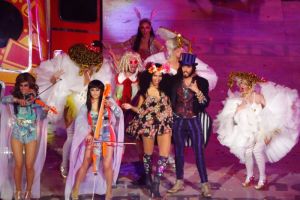 Russel Brand doing Willy Wonka was up next and what a trip that was. Old Russ shows up on top of what reminded me of the Partridge Family’s bus, segues into I Am the Walrus, accompanied by what appeared to be the classical group Bond wearing some sort of caped castoffs from the Austin Powers wardrobe department. Then the bus transforms into a giant octopus and spits out Fatboy Slim. I had a dream like that once… it was after a lot of absinthe.