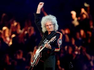 Now here’s where NBC should’ve taken note. A video clip of the legendary Freddie Mercury brought possibly the biggest audience response. This video is from 1986! Then, from the end of the stadium, some recognizable guitar work by a recognizable hair style. Highly regarded astrophysicist Dr. Brian May strapped on an axe to prove he can still jam. Wait… he was a rock star before being an astrophysicist? Who knew? So, he played some blazing guitar licks and headed to center stage while from the other end, Kat von D marched toward the center sporting a coat/dress/train about 40 yards long. Out of the center stage rose a drum kit with Roger Taylor aboard. The reconstituted Queen started playing We Will Rock You with Kat von D on the vocals. Funny… she sounds like Jessie J. Jessie von J had a tick too much reverb going on and after she was done caterwauling her way through the song it dawned on me that the fans who had to witness the sonic assault would’ve been better served by a holographic Mercury or even had they dragged Paul Rodgers out from under whatever rock he hides under. Still no sign of John Deacon, though. We were treated to Jessie von J whipping her hair, though. Probably looked better than Paul Rodgers would have.