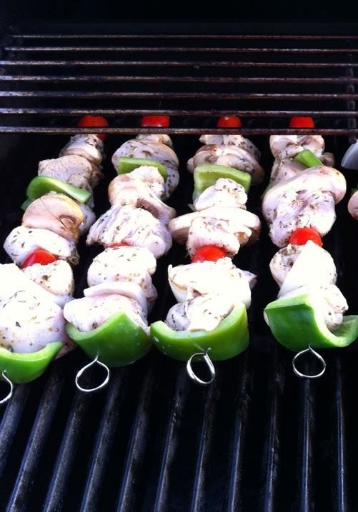Just kidding. I’m gradually getting back on the healthy eating train. Yesterday, I made some chicken skewers for lunch that turned out yummy. I’ll post my marinade recipe below. I usually alternate the meat with slices of green pepper, sweet onion and tomato. I will use mushrooms, too, if I have some in the fridge. I like to get the grill heated up, spray the grates with cooking spray, then back the beat off as soon as I put the skewers on. This allows the meat to get some grill marks and a bit of a sear without overcooking the meat.