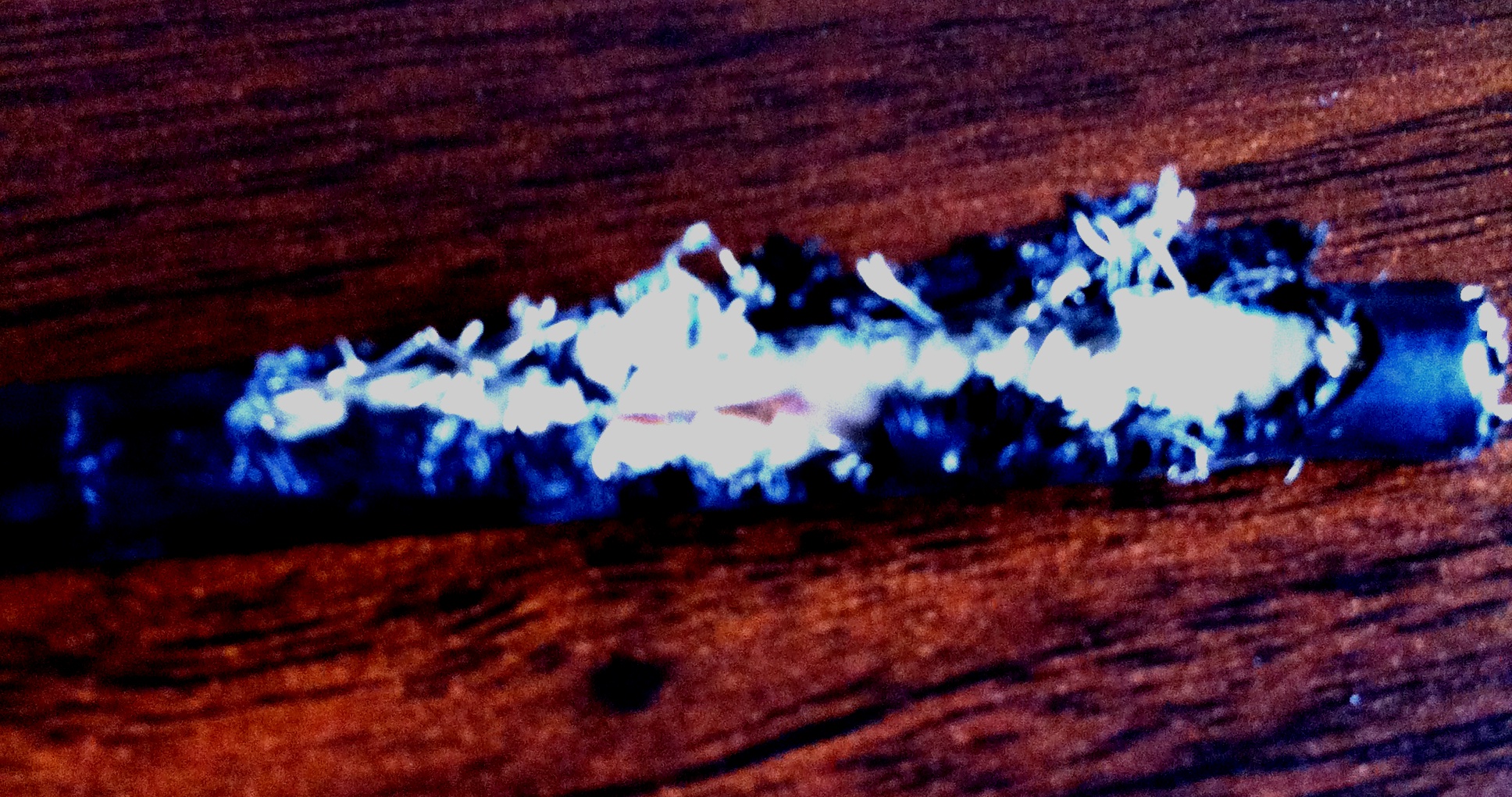 The tech came in the house, wearing booties so as not to dirty the carpet. He unplugged the line from the modem and ran some tests, detecting some strange readings to the signal strength. We said he wanted to check stuff out where the line comes into the house. About 5 minutes later, he came back and said, “I found it.”