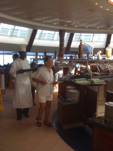 We got everyone loaded on the bus and headed to the port. It’s about a five-minute ride from the hotel, but it’s quite a sight to see this giant white cliff towering 11 decks above the waterline. The ship, Royal Caribbean’s Grandeur of the Seas, is actually a smaller ship as cruise ships go. It’s beautifully appointed, though… glass, marble, open atrium. Our stateroom was not ready when we boarded, so our group found some space on Deck 9, where RCCL was providing a buffet lunch.