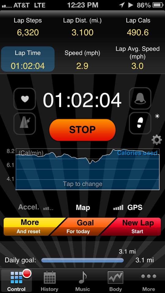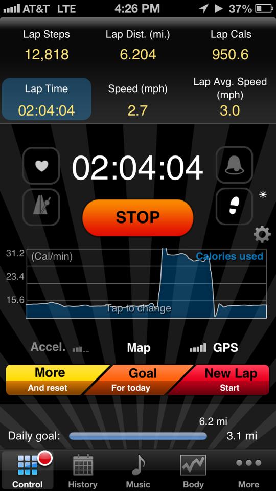 Started out swimmingly. The sun felt good, just being outside felt good. Started up my pedometer app and walked. The iPhone served up a nice selection of tunes to keep me moving (Ozzy, Cake, Chic, Iron Maiden, Eminem, and NWA, to name a few). All good.