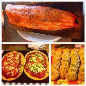 Top: Roasted cedar plank salmon with olive oil and fresh ground pepper; bottom left: veggie flatbread pizza; bottom right: my almost famous chocolate chip cookies.
